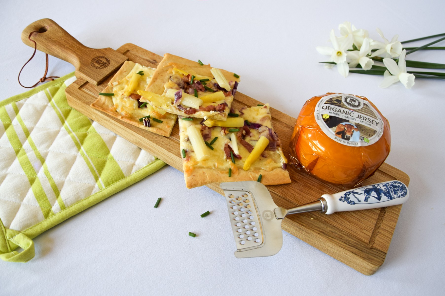 Voor de liefhebbers van culinair eten hebben we een geweldig recept: Flammkuchen met asperge à la Henri Willig: een smakelijke combinatie van kaas, asperges, spek en ui. Onze premium kazen zoals de Biologische Jersey, Jersey Knoflook, Kruiden & Knoflook Koekaas en de Schapen Rozemarijn & Tijm geven deze Flammkuchen een onweerstaanbare smaak. Ontdek dit gerecht, dat zijn oorsprong vindt in de Elzas, met zijn knapperige dunne deeg, romige crème fraîche en hartige topping. Of je het nu als bijgerecht, brunch gerecht of lichte avondmaaltijd serveert, deze Flammkuchen met asperge zal zeker in de smaak vallen.