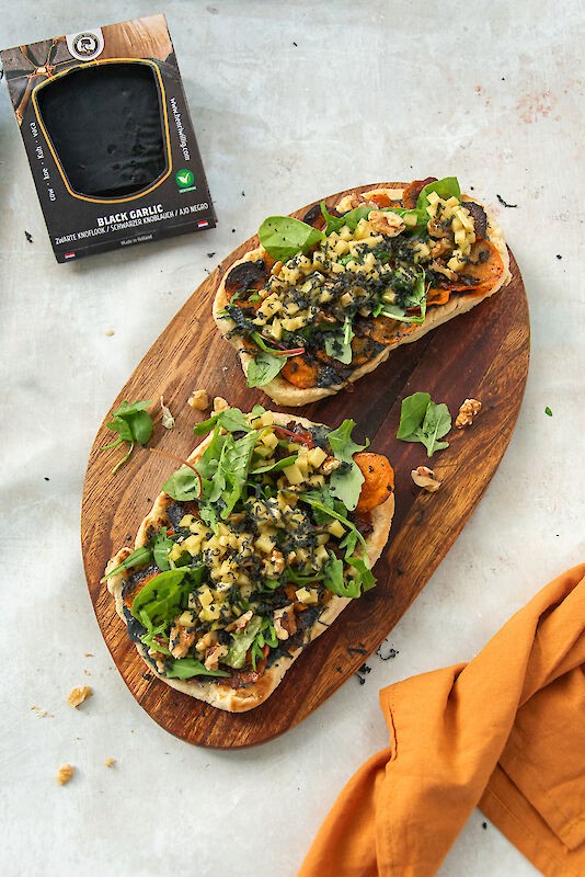 Bestreichen Sie die warmen Fladenbrote mit der Schwarzkohl-Käse-Mayonnaise. Verteilen Sie die gerösteten Süßkartoffeln und roten Zwiebeln darauf. Garnieren Sie mit Rucola und gerösteten Walnüssen. Zum Schluss die Apfelessig-Vinaigrette darüber träufeln und nach Belieben etwas zusätzlichen geriebenen Schwarzkohl-Käse als Topping streuen.