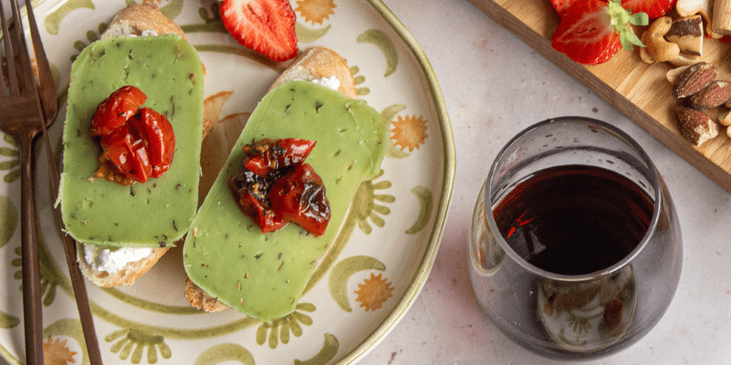 Fraîche et croquante : ricotta crémeuse avec zeste de citron, tomates grillées et fromage au pesto vert salé.