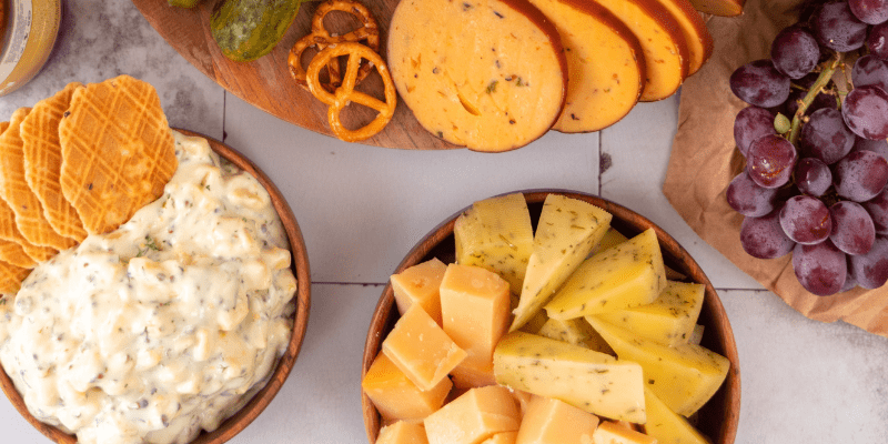Parfait pour partager à table : mélange de fromage de chèvre extra-vieux et fromage aux herbes et à l’ail dans du vin blanc.