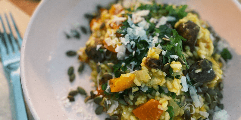 Le risotto automnal ultime : courge rôtie sucrée, champignons de Paris et fromage de chèvre bio crémeux.