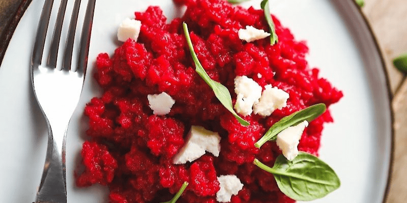 Comment le préparer : Faites cuire le riz à risotto avec le bouillon, ajoutez les betteraves rôties et incorporez à la fin le fromage de chèvre et le zeste de citron.