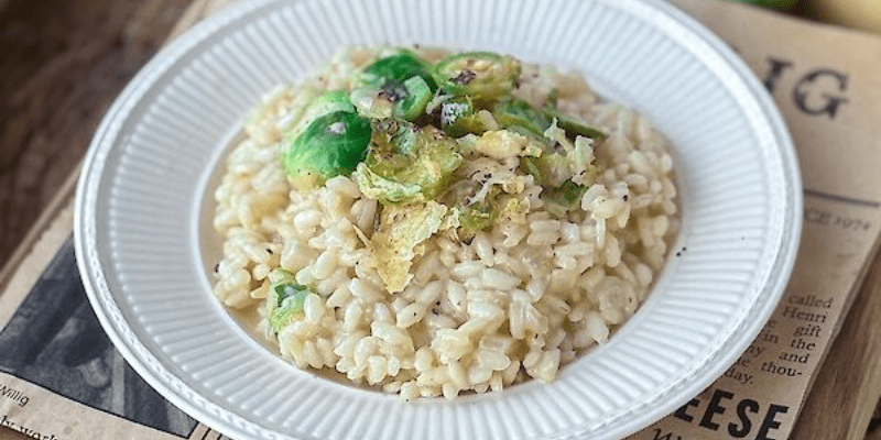 Comment le préparer : Préparez le risotto avec le bouillon et l’oignon, ajoutez le fromage à la truffe à la fin et terminez avec les choux de Bruxelles rôtis.